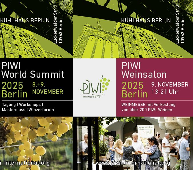 Am 8. und 9. November 2025 findet in Berlin das große Treffen von PIWI-International statt. Am 8. November gibt es eine Tagung mit Workshops und Winzerforum im Kühlhaus in Berlin statt. Am Sonntag den 9. November gibt es eine Weinmesse mit Verkostung von über 200 PIWI-Weinen. Wir (Ulrike und Markus) sind mit unseren Weinen dabei. Kommen Sie auch. Mehr INFO über https://piwi-international.org/piwi-world-summit-2025_programm/