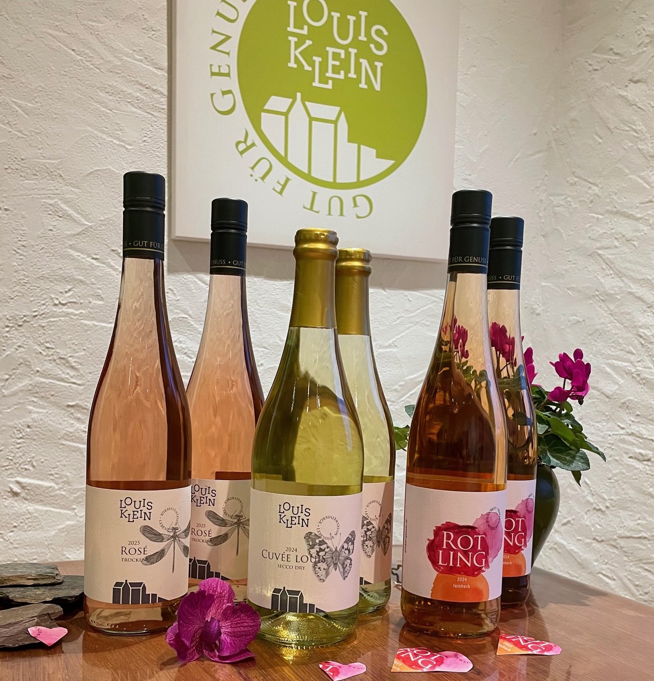 Das Weinpaket „Kleine Freude“ besteht aus zwei Rosé Weinen, zwei Rotling feinherb und zwei Secco „Cuevée Louis“.